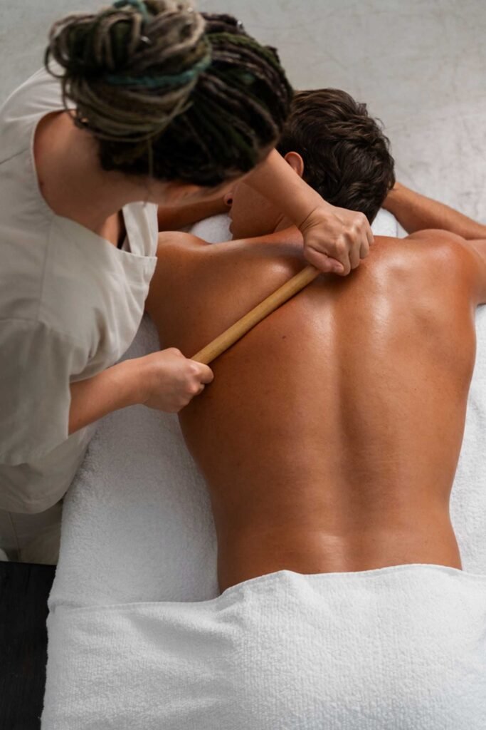 Bamboo massage benefits include deep muscle relaxation, improved circulation, and increased flexibility, making it effective for reducing muscle tension, stress, and pain. It can also promote lymphatic drainage, improve sleep, and stimulate skin repair. The deep relaxation and pain relief can lead to a significant reduction in stress and anxiety.